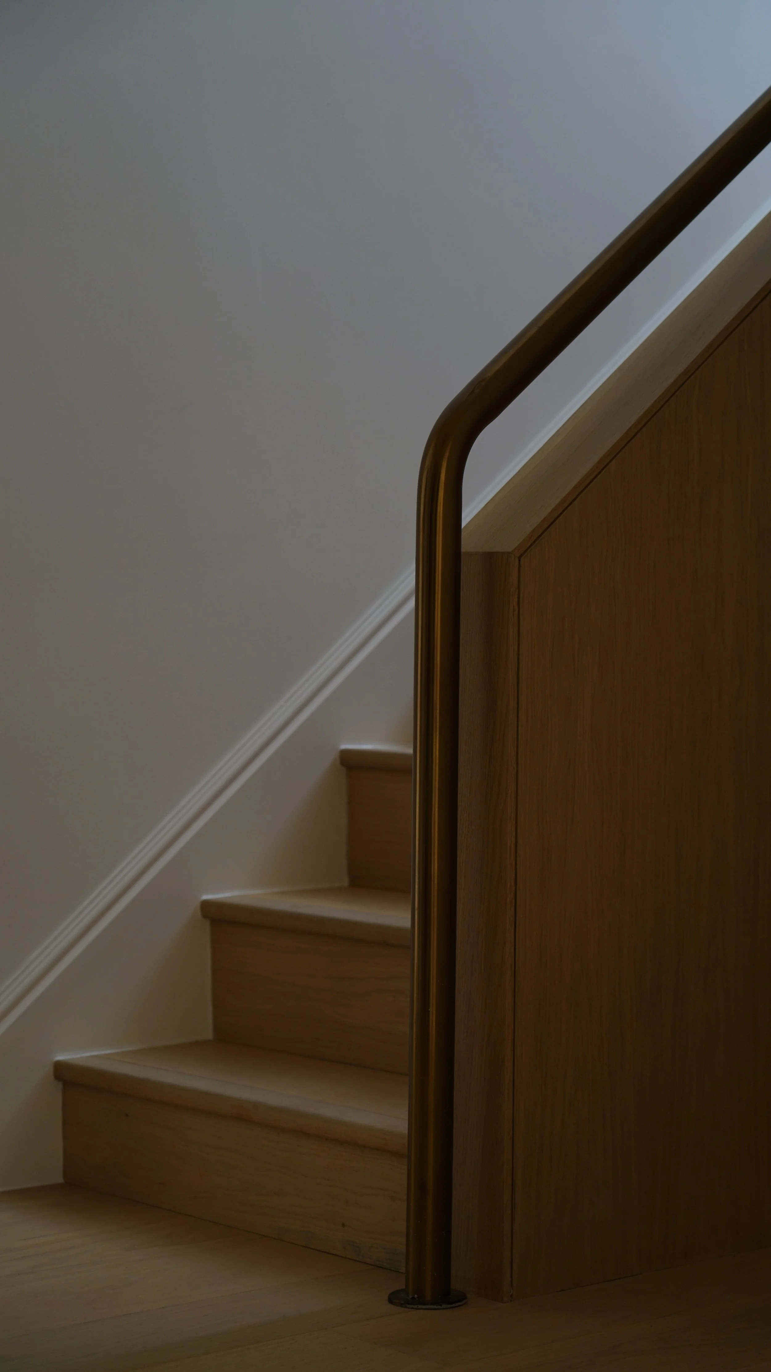 Originally, the interior design of this home felt quite fragmented. On this floor, for instance, we had a very busy marble pattern and dark wood in the rooms. The original stair was a standout element with its brass handrail but was clad in black marble, giving it a look I'd describe as quite 'Lex Luthor'!